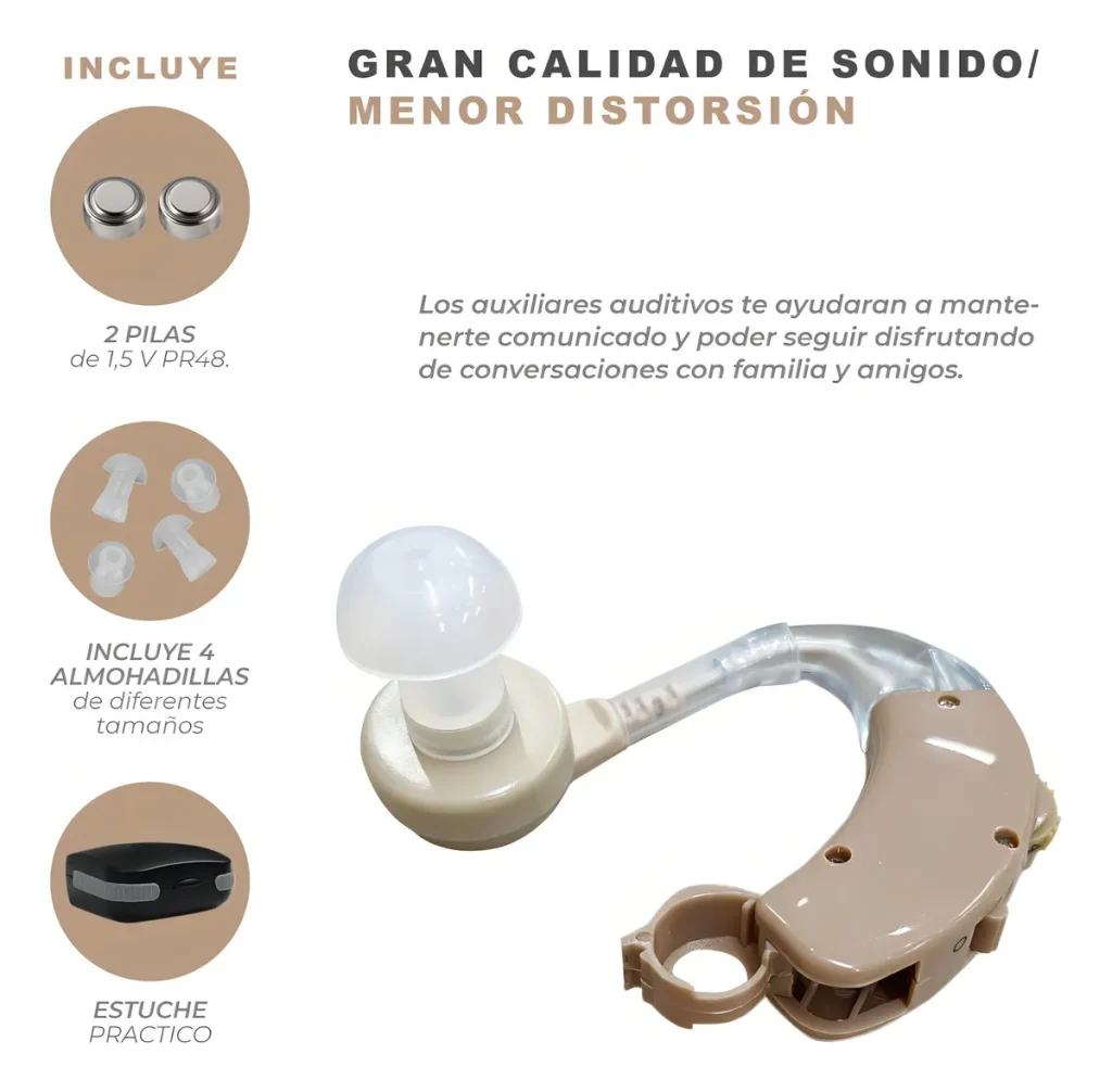 El Audífono Amplificador Auxiliar Auditivo Sordera Ha20 es un dispositivo diseñado para mejorar la experiencia auditiva en todos los aspectos, desde conversaciones hasta música y la belleza de los entornos naturales. CARACTERÍSTICAS DESTACADAS: -Amplio rango de frecuencias: 200 – 6000 Hz. -Dimensiones compactas: 40 x 40 x 12 mm. -Incluye 4 almohadillas de diferentes tamaños para un ajuste personalizado. -Viene con un estuche práctico para mayor protección y comodidad. -Funciona en ambos lados, proporcionando una experiencia auditiva completa. -Ofrece un rango extendido de amplificación de frecuencias: 40 dB ± 5 dB. -Posibilidad de adaptación individualizada al conducto auditivo. -Especialmente diseñado para personas con dificultades auditivas. -Amplificación máxima de hasta 40 dB. -Volumen máximo ajustable: 130 dB. -Clasificación de producto sanitario para tu tranquilidad. -Requiere 2 pilas de 1,5 V PR48 para su funcionamiento. -Elegante color beige para una discreción óptima. -Proporciona una amplificación nítida tanto en interiores como en exteriores. Este aparato auxiliar auditivo es una excelente opción para mejorar tu experiencia sonora.
